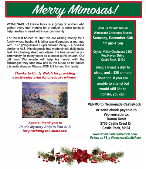 Womenade is raising funds for a family in need at their annual Christmas Brunch on Dec 13 from 11:00am to 1:00pm at the Crystal Valley Clubhouse. Learn more about this wonderful organization here.